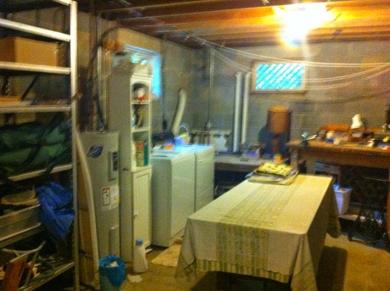 This unfinished area of the basement serves as a laundry room, storage room, and workshop. Supplies such as beach chairs, cleaning supplies, and tools can be found in this area. There is a table set up for folding laundry and clotheslines for hang-drying as well.